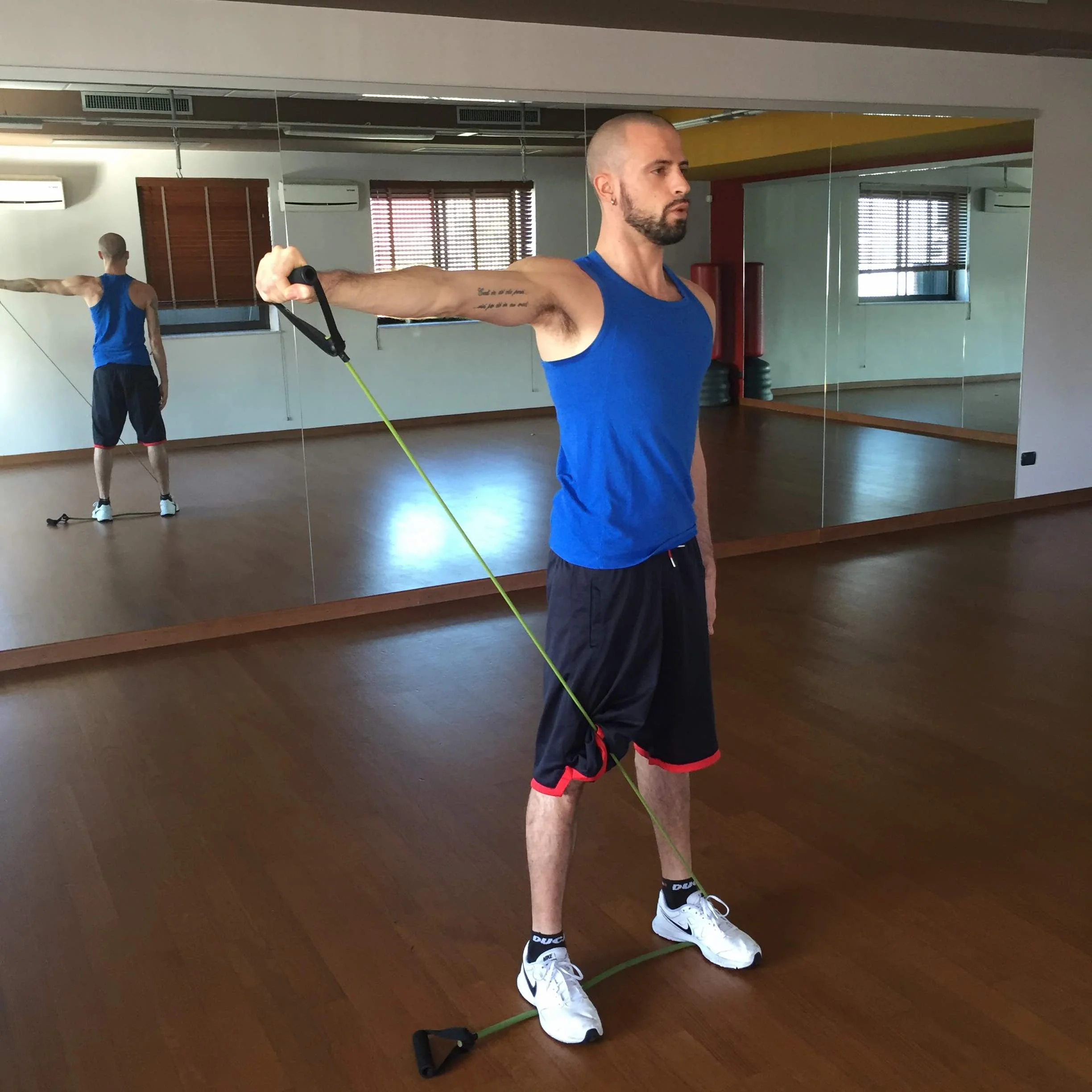 Braccio lungo il fianco, polso verso l'anca, manubrio o elastico in mano che, disegnando un arco esterno, stende l'arto sino all'altezza della spalla per poi tornare alla posizione di set-up. Eseguendo questo esercizio con il manubrio, raggiungi il punto di massimo lavoro quando il braccio arriva all'altezza della spalla, poiché il carico di lavoro è alla massima distanza possibile dal muscolo sottoposto al lavoro, ossia il deltoide. Con l'elastico, bloccandolo questa volta con il piede opposto, il punto di lavoro lo raggingi già a metà apertura e da lì in poi, la resistenza aumenta (!!) fino ad arrivare (se ce la fai) all'altezza della spalla. Di nuovo: un arco di lavoro più grande.